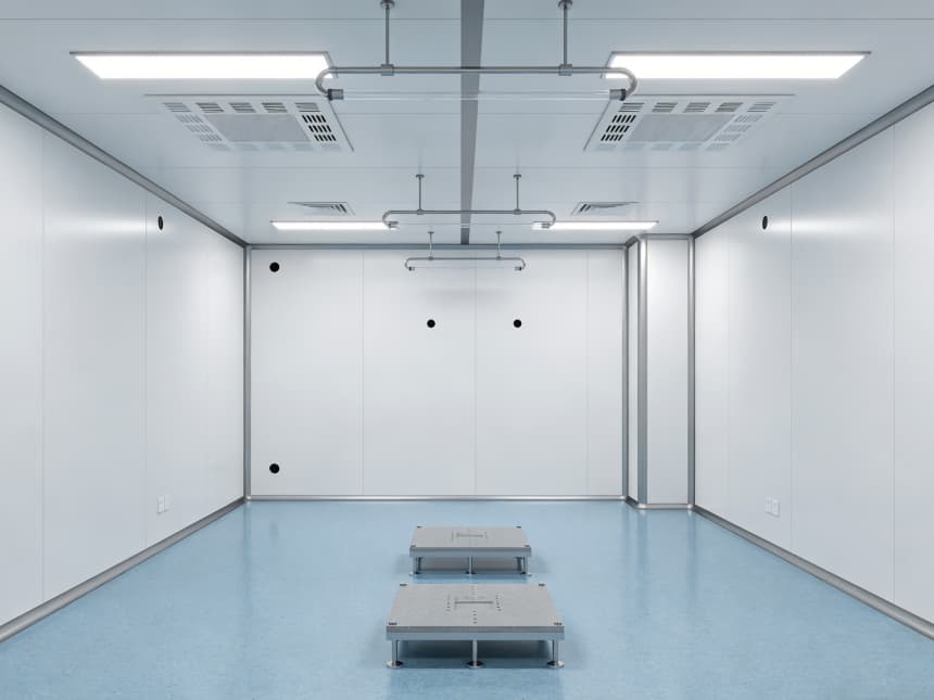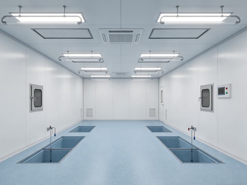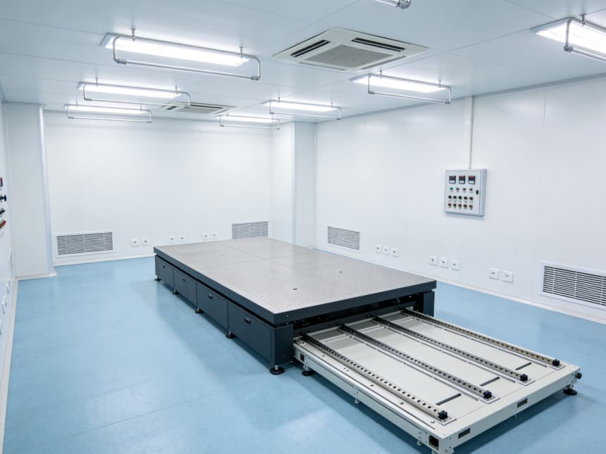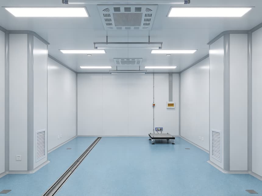电子光学车间内部细节设计精准匹配行业核心需求,整体采用浅蓝色防静电洁净地坪与白色无缝洁净墙面的组合,风格简约统一。地面选用3mm厚环氧防静电材质,表面经哑光工艺处理,既能有效规避强光反射对光学检测造成的干扰,又具备10?-10?Ω的稳定防静电性能;同时兼具优异的耐磨特性,可耐受酒精等常用清洁剂擦拭,墙角均采用50mm圆弧设计,从根源上消除积尘死角,筑牢洁净基础。
