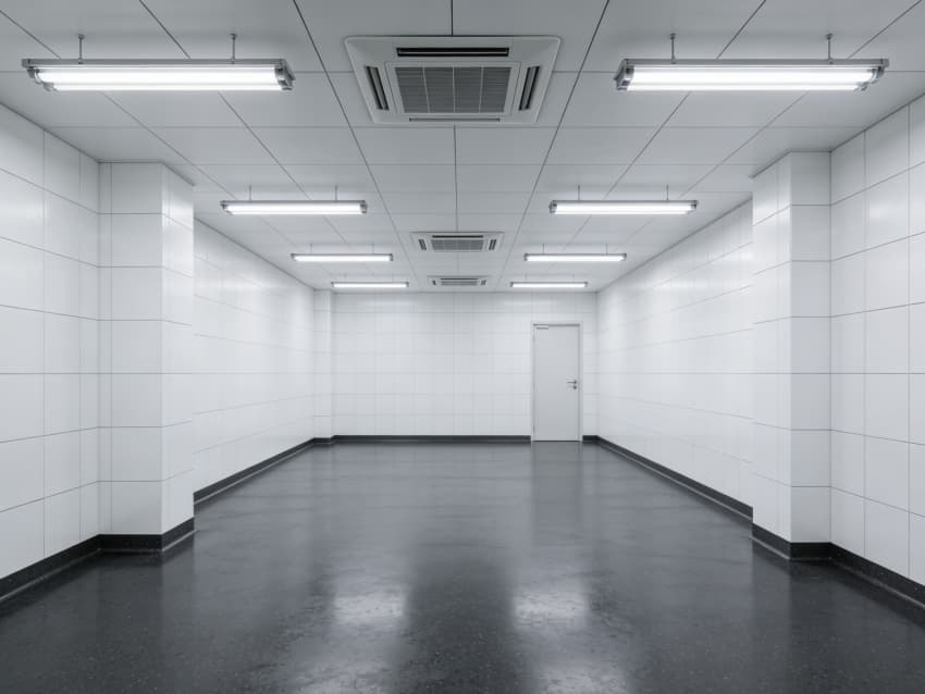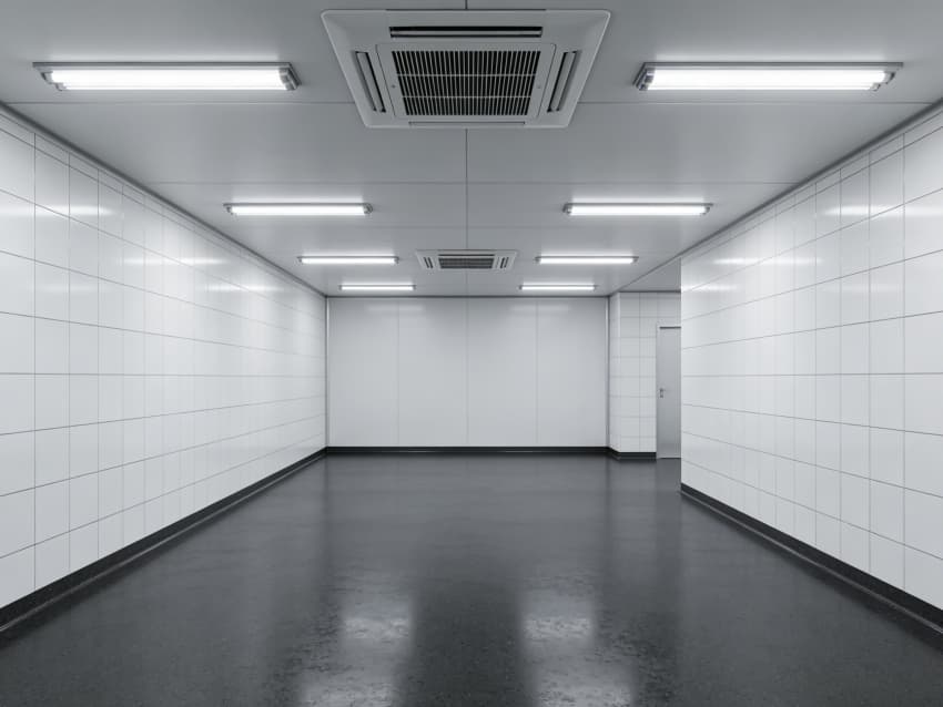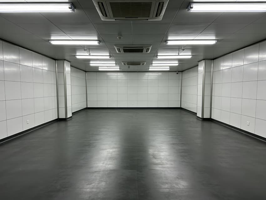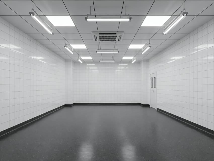 车间内部施工工艺凸显耐腐洁净特性:地面采用深灰色重防腐环氧自流平工艺,经基层喷砂处理、防腐底漆涂刷、环氧砂浆找平、自流平罩面四道关键工序,表面平整度误差≤1mm/m,耐酸碱、耐有机溶剂腐蚀,附着力达2.0MPa以上;墙面采用白色食品级洁净抗菌涂层施工,推行无缝拼接技术,阴阳角采用R50圆弧倒角工艺,杜绝积尘死角,涂层硬度达2H,可耐受高频次消杀。