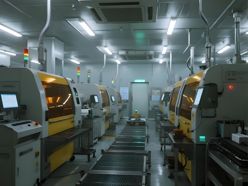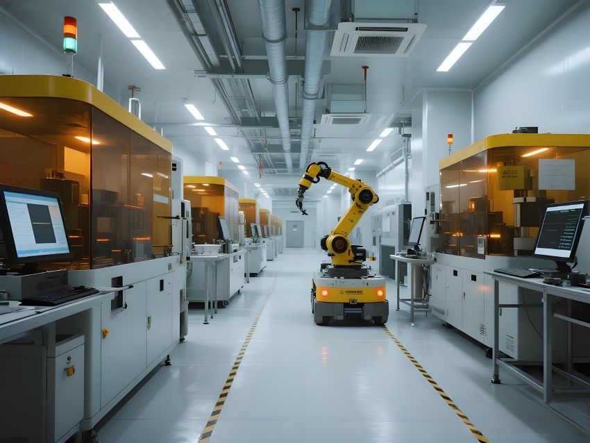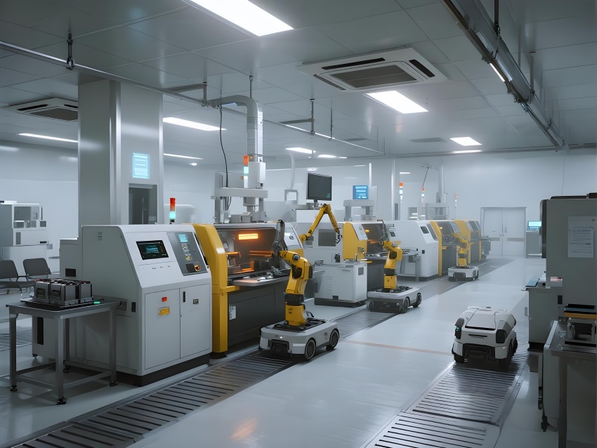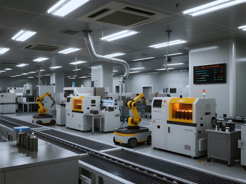 本车间以“精密制造+极致洁净”为核心,采用未来工业风设计,主色调为冷银灰与警示黄,强化功能分区。顶棚矩阵式FFU单元配合地面格栅回风,形成垂直层流,蓝色气流轨??墒踊幌越嗑欢?。电极区配备全封闭涂布机,机械臂精准运作;电芯装配区采用防静电工作台,激光焊接火花与冷色调环境形成对比。注液区全封闭氮气手套箱搭配琥珀色警报灯,确保绝对干燥?;汕帕凶胖悄芪驴毓?,数据看板实时监控电池参数。AGV机器人沿磁轨穿梭,与悬吊式管道系统构成高效物流网络。整体空间融合精密机械的冷峻美学与智能制造的科技感,打造高可靠性的锂电池生产环境。