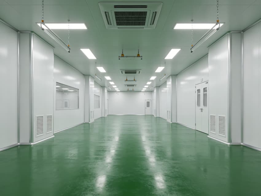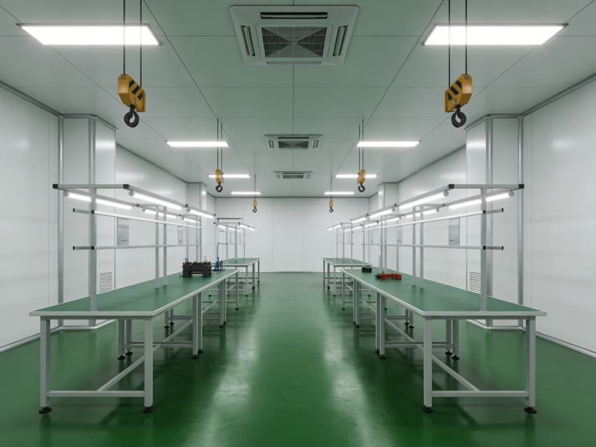 墙面采用白色食品级洁净抗菌涂层施工,推行无缝拼接与高精度找直工艺,阴阳角采用R50圆弧倒角处理,杜绝积尘死角,涂层附着力达2.5MPa,硬度≥2H,可耐受高频次洁净消杀与工业粉尘防护。各功能区域针对性实施专项工艺:核心加工区地面增设多层阻尼减震垫层,采用浮筑地面施工技术,有效隔绝振动干扰;检测区墙面做保温隔热一体化处理,预留精密仪器专用管线预埋孔,确保恒温恒湿环境稳定;装配区采用防静电接地网格预埋工艺,保障零件装配过程静电安全。