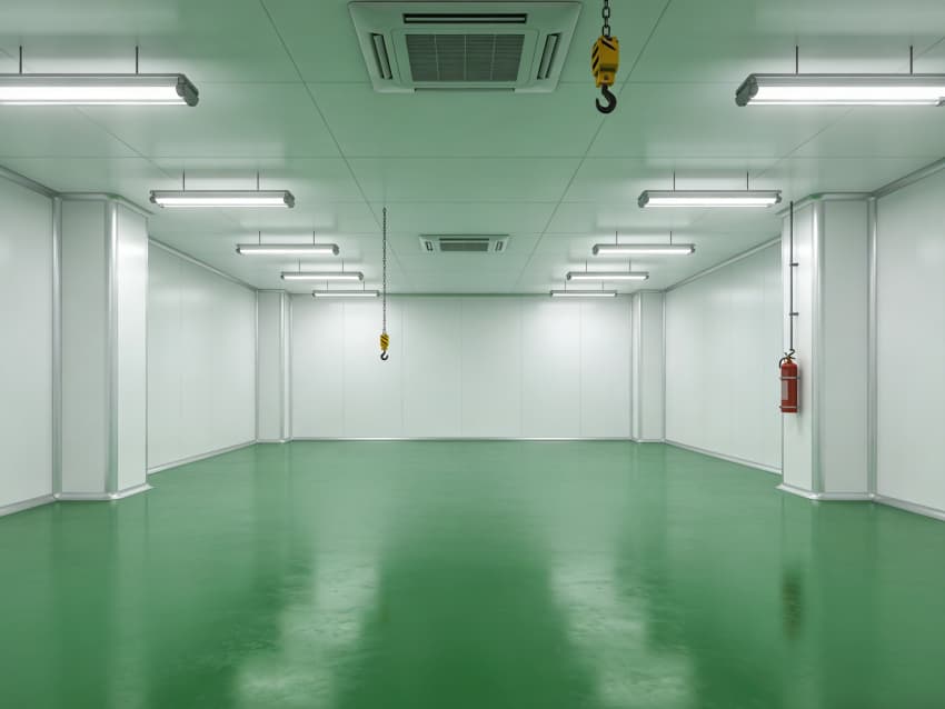 航天航空零件生产车间内部施工以“超高精度、极致洁净、抗扰稳定”为核心,采用系列尖端工艺技术,适配精密零件加工的严苛要求,同时实现地面绿色、墙壁白色的统一风格。地面采用绿色防静电耐磨环氧自流平工艺,经基层抛丸强化、高渗透界面剂处理、环氧砂浆精准找平、自流平罩面固化四道核心工序,表面平整度误差控制在0.5mm/m内,防静电性能达10?-10?Ω,抗压强度超C40,可耐受精密设备碾压与切削液侵蚀。