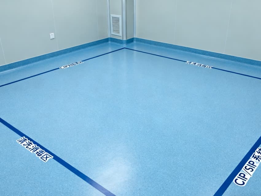 设计在环境防护上针对性突出:地面采用蓝色耐腐环氧材质,可耐受酸碱类药剂侵蚀,且无缝拼接设计便于清洁消毒;四周浅灰色抗菌墙壁采用防霉涂层处理,配合圆弧墙角结构,避免药液残留与粉尘堆积,搭配顶部层流送风系统,能稳定维持万级洁净度,满足药剂配液对微环境无菌性的严苛要求。