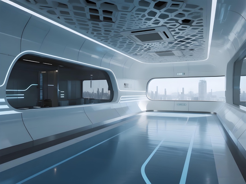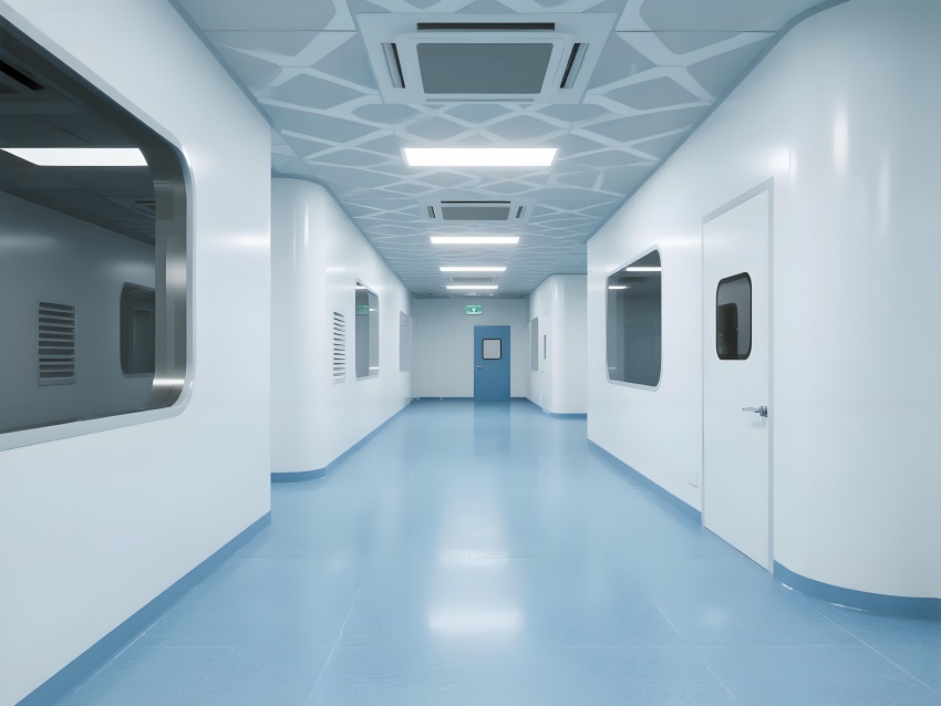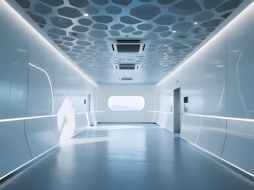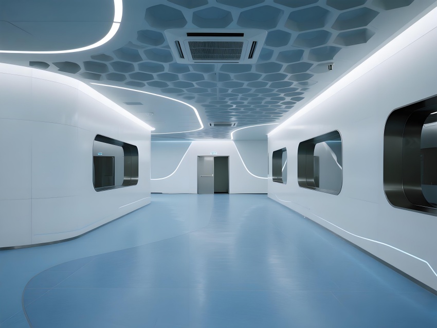 本车间空间以冰川蓝与钛白为主色调,弧形墙角与无缝地坪构成流畅的洁净界面,顶部蜂窝状FFU阵列形成科技感天花肌理。灌装区透明亚克力防护罩展示自动化生产线运作,配合层流工作台的红色气流可视化设计,强化无菌核心概念。功能??橥ü孛婊疑际哟璞盖木得娌恍飧钟肟刂泼姘宓睦渡彻庑纬衫涞鞴庑?。玻璃观察窗嵌入电子压差计,走廊的渐变光环境引导系统在满足GMP动态监测要求的同时,营造出未来实验室般的专业氛围,缓解员工长时间密闭作业的疲劳感。