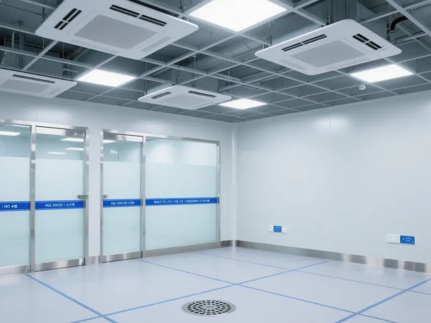 车间的天花板上安装了多个方形的照明灯,提供充足的光线,同时还有通风设备,确??掌魍ǎ3殖导淠诘目掌嗑欢却锏酵蚣侗曜?。墙壁上有一些玻璃窗户和门,便于观察内部情况。