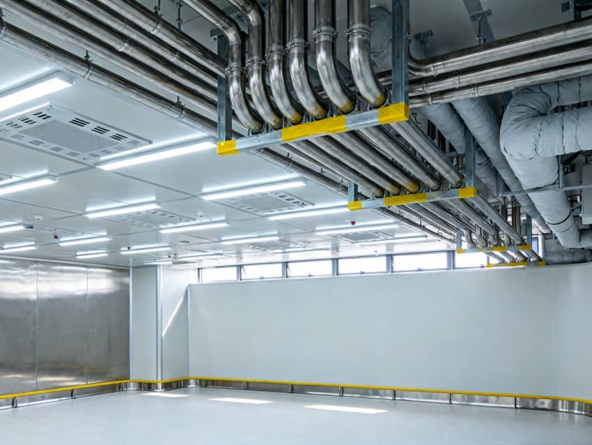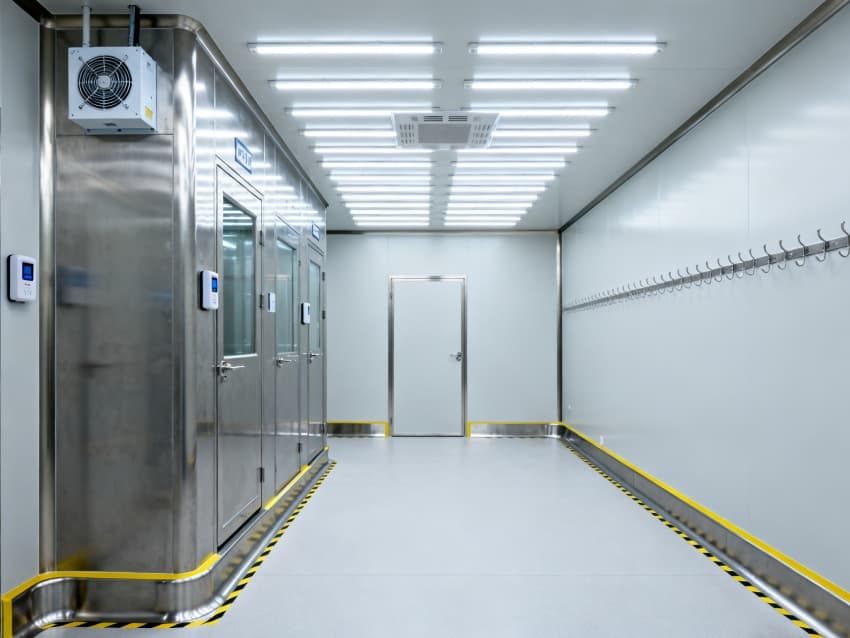 内部按芯片工艺流程划分光刻辅助区、晶圆预处理区、封装过渡区等,各区域通过无尘传递舱衔接。车间严格执行万级洁净标准(ISO8级),每立方米空气中≥0.5μm微粒数≤352000个,采用初效-中效-高效-化学过滤四级净化系统,配合垂直层流送风,每小时空气置换25-30次。墙面为防静电不锈钢板,地面是环氧树脂自流平材质,温度稳定在23±1℃、湿度45±3%RH,同时配备静电消除装置,避免微粒与静电影响芯片良率,完全契合芯片生产严苛要求。