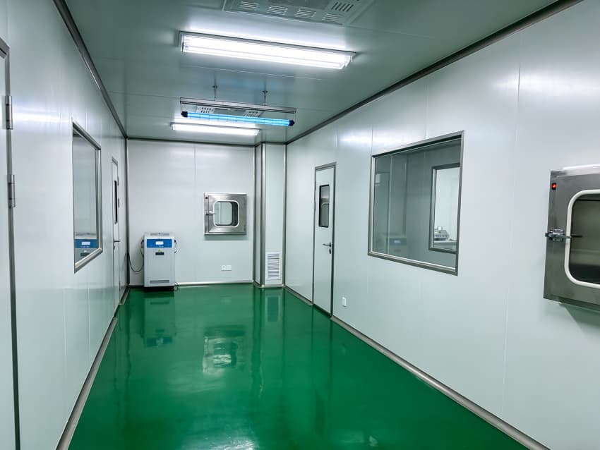 整体空间采用医药级洁净围护体系:墙面与顶板选用抗菌型洁净彩钢板,搭配圆弧角收边与密封胶条,彻底消除积尘死角;地面为绿色防静电环氧自流平材质,表面光滑耐磨、易清洁消毒,同时具备静电消散功能,避免静电对药品的潜在影响。吊顶集成 FFU 风机过滤单元与恒温恒湿控制系统,可稳定维持十万级洁净度与 18-26℃的工艺环境,通过压差管控保障各区域空气单向流动,有效防止交叉污染。