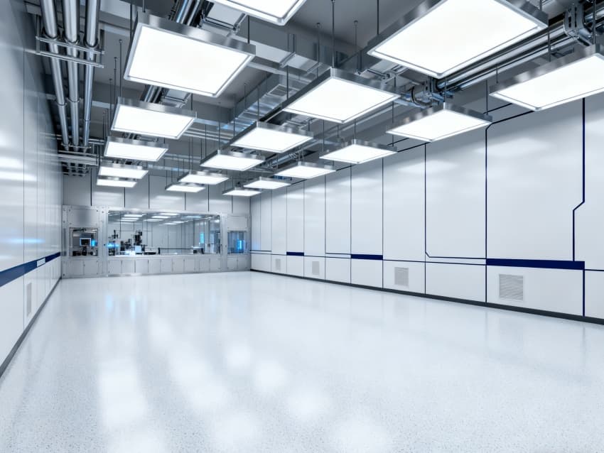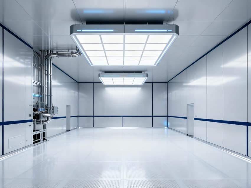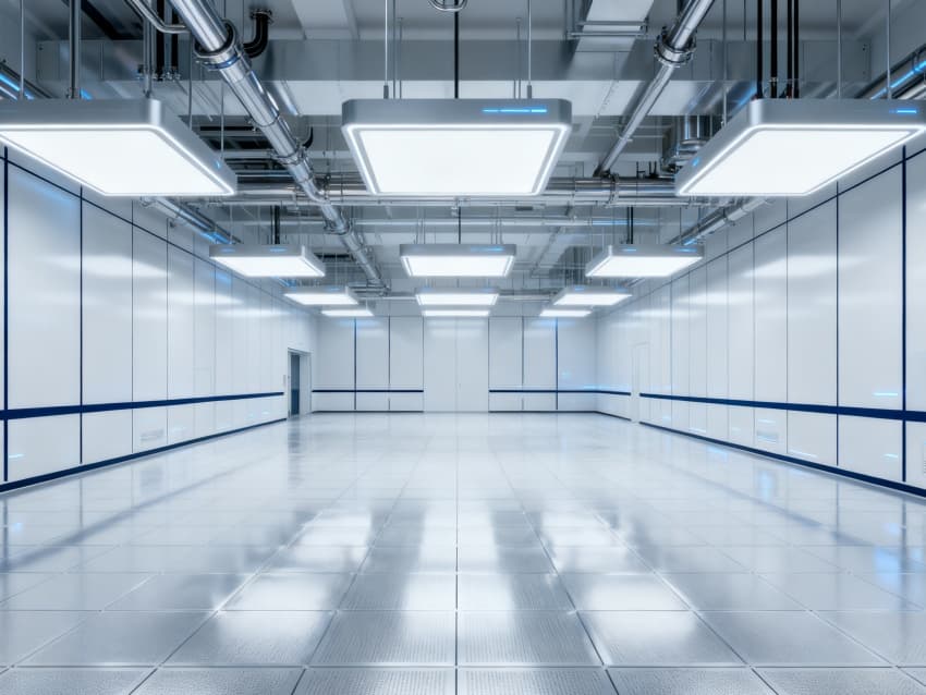 内部6个量子车间均为无设备空旷布局,按千级洁净标准与防电磁干扰要求建设:地面铺设防静电环氧自流平,墙面采用无磁不锈钢洁净板,阴阳角做R50圆弧处理;柱网间距设为8米,预留充足设备安装与运维空间;顶部整合恒温恒湿系统、高效送风口及防眩光LED照明,设备管线暗藏设计,进一步强化空间空旷感,为量子芯片测试、量子传感研发等场景提供稳定、洁净的专属环境。