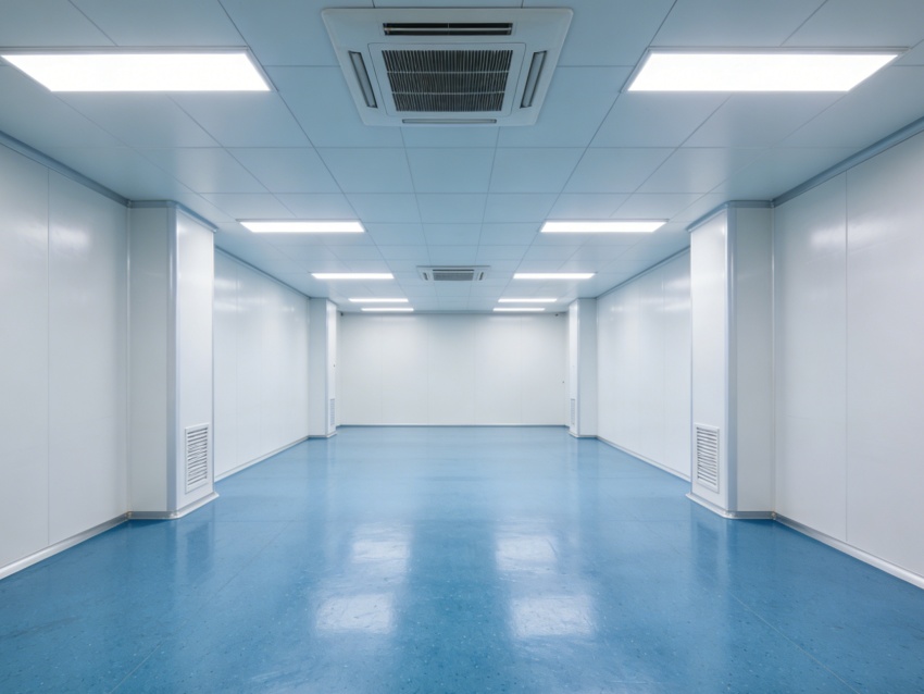 本次呈现的厂房电子光学车间,整体风格简约专业,精准匹配电子光学器件研发与生产的核心需求。厂房外立面采用浅灰色工业基材搭配大面积高透玻璃幕墙,既保障建筑密封性与隔音性,又为内部车间引入充足自然光,外观简洁大气且兼具工业质感与科技感。均以蓝色防静电洁净地坪搭配白色无缝洁净墙面。蓝色地面选用高耐磨环氧材质,具备10?-10?Ω防静电性能,可有效规避静电对光学元件的损害,表面哑光处理减少光线反射;白色墙面采用环??咕坎?,无缝拼接设计消除清洁死角,搭配嵌入式防眩光照明,营造稳定的视觉环境。