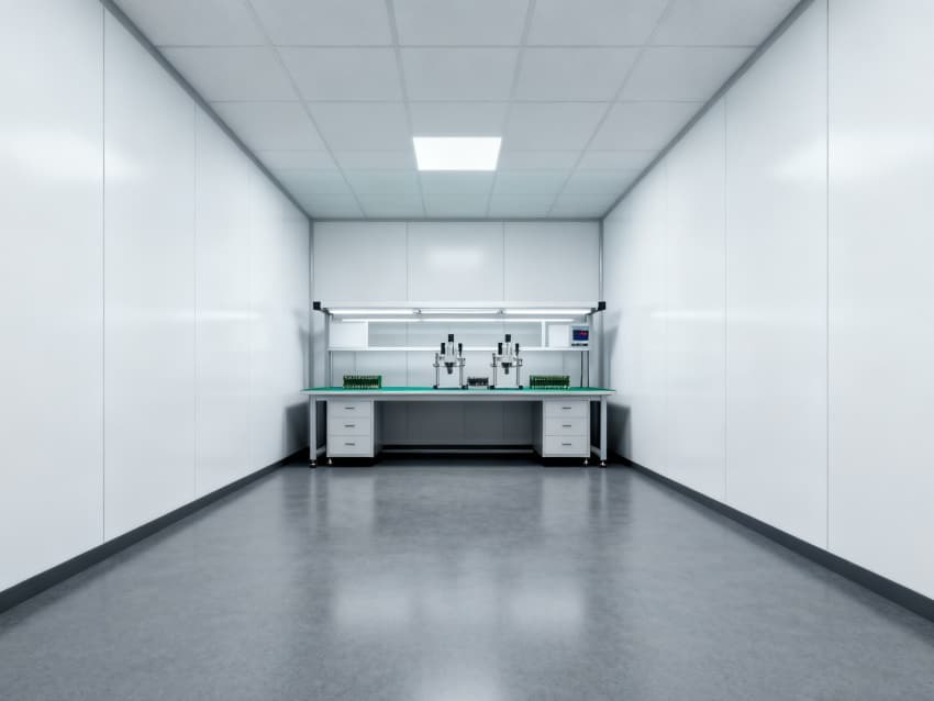 洁净度保障:四周墙面选用哑光白色防尘材料,通过漫反射处理有效减少光线干扰,搭配顶部配置的HEPA高效过滤系统,可将车间洁净度稳定控制在千级标准,确保生产环境免受粉尘、微粒等污染物侵扰,为精密贴装作业提供极致纯净的空间保障。