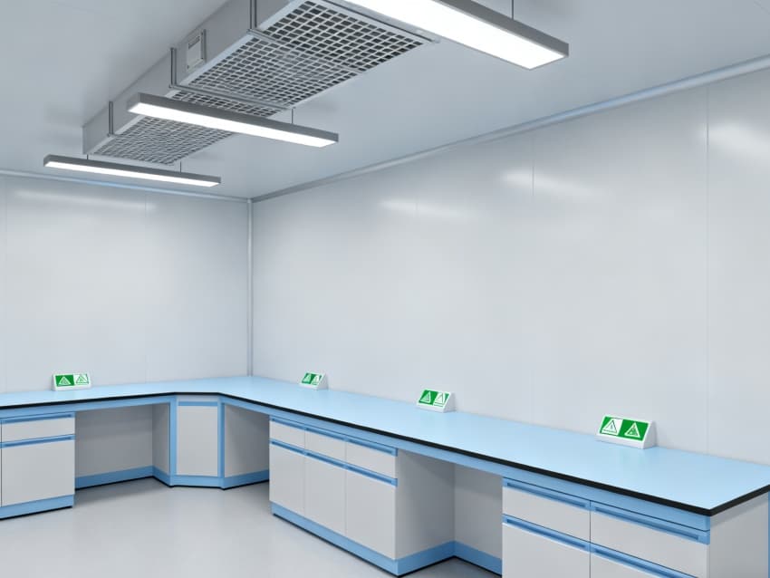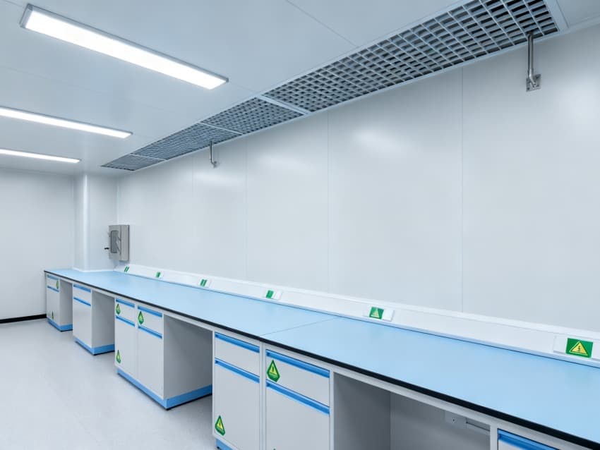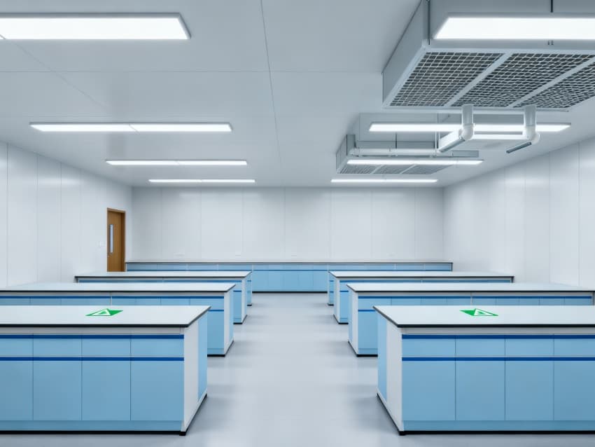 在核心操作区域,我们执行的是高标准的洁净要求,每立方米空气里直径0.5微米以上的灰尘、颗粒等杂质不能超过352000个,相当于达到了万级洁净标准(国际ISO8级)。而像走廊、储物间这些辅助区域,要求会稍微低一些,执行的是十万级洁净标准(国际ISO9级)。采用初效-中效-高效三级空气过滤系统,配合侧送顶回气流设计,实现每小时18-22次空气置换;墙面选用耐酸碱洁净彩钢板,地面为防滑PVC无菌卷材,所有边角做圆弧密封处理,减少清洁死角。室内温度稳定在22±2℃,相对湿度控制在45%-55%,关键实验区维持微正压,有效隔绝外界污染与交叉感染,既符合高校生物实验教学规范,也为科研数据准确性提供可靠环境保障。