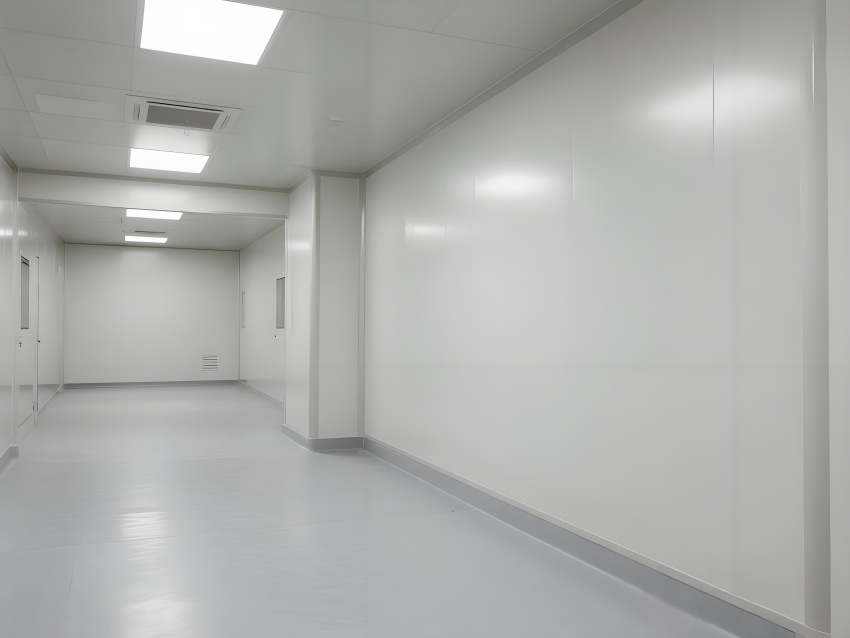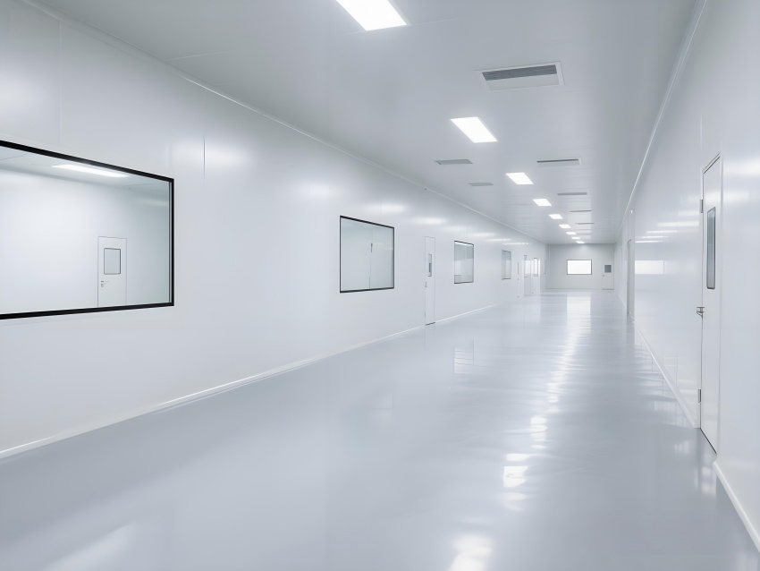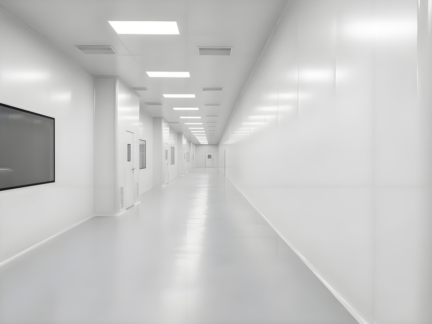 本净化车间采用"科技极简主义"风格,通过流畅的线性布局与模块化设计强化专业感。主空间以珍珠白与浅灰为基调,搭配天蓝色送风管道形成视觉引导,环氧地坪的镜面效果反射顶部蓝色净化灯带,营造无菌环境的通透感。设备区采用不锈钢原色与玻璃观察窗形成材质碰撞,电子屏实时数据可视化增强科技属性。严格的人货分流设计通过色彩编码实现功能识别,墙面嵌入式消防与应急系统保持视觉平整。整体空间通过减少视觉噪点、强化功能分区线条,在满足GMP动态洁净要求的同时,呈现现代食品工业的精密与秩序之美,透明亚克力标识牌与柔光照明进一步减轻密闭空间的压抑感。