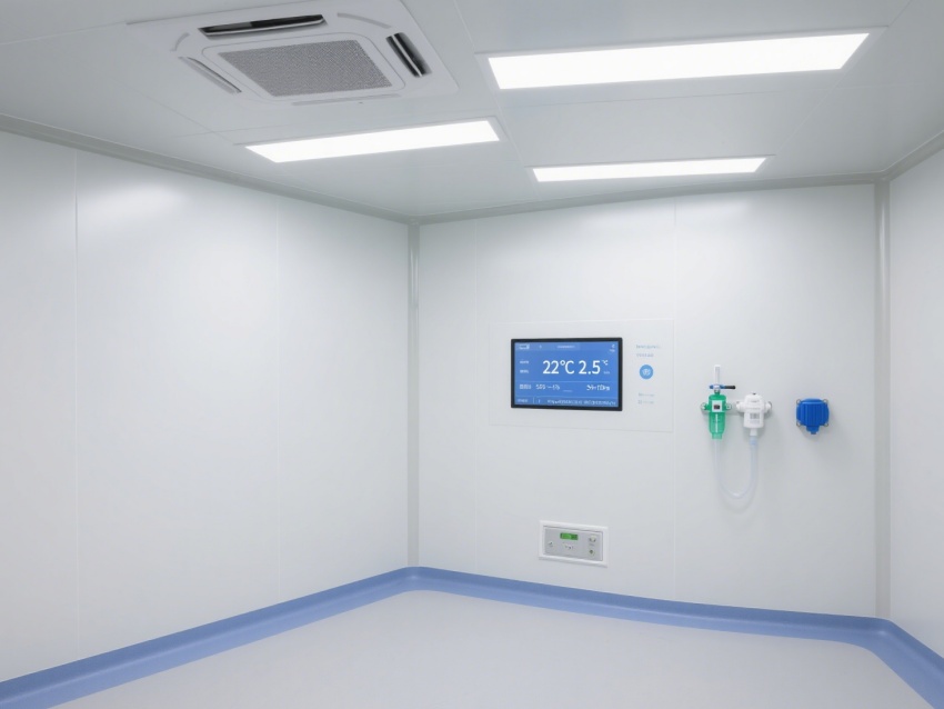 该医疗无尘室是为医疗诊疗与精密操作打造的专业洁净空间。室内以白色为主调,搭配蓝色标识系统,墙面、地面采用无缝抗菌材质,便于清洁消毒,有效防止微生物与灰尘污染。